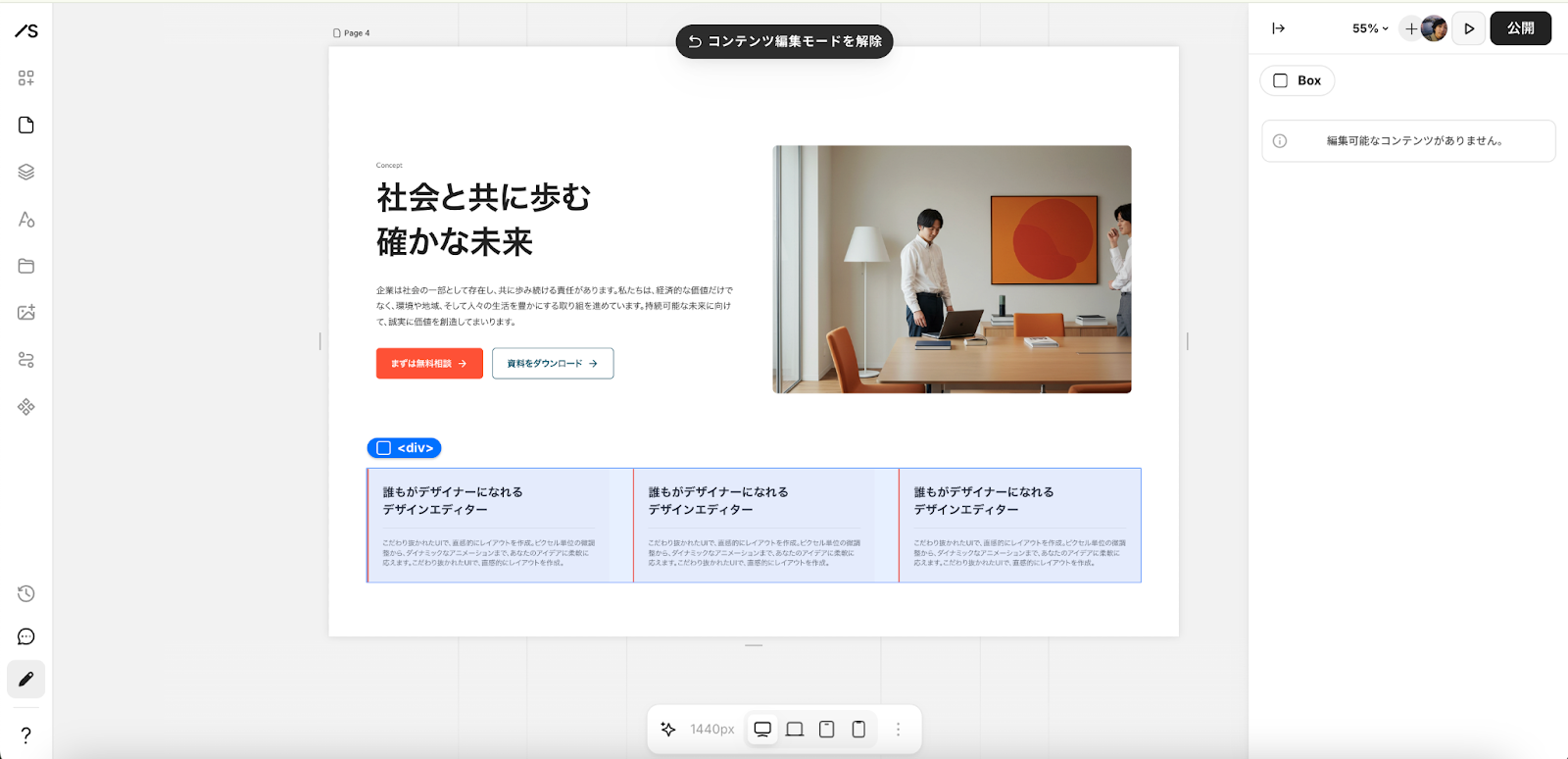 編集モードに切り替わると、編集可能なコンテンツが右のサイドバーに一覧表示されます。「コンテンツ編集モード」では、選択したボックスのコンテンツ(テキスト・画像・アイコン)のみが編集できる状態になります。